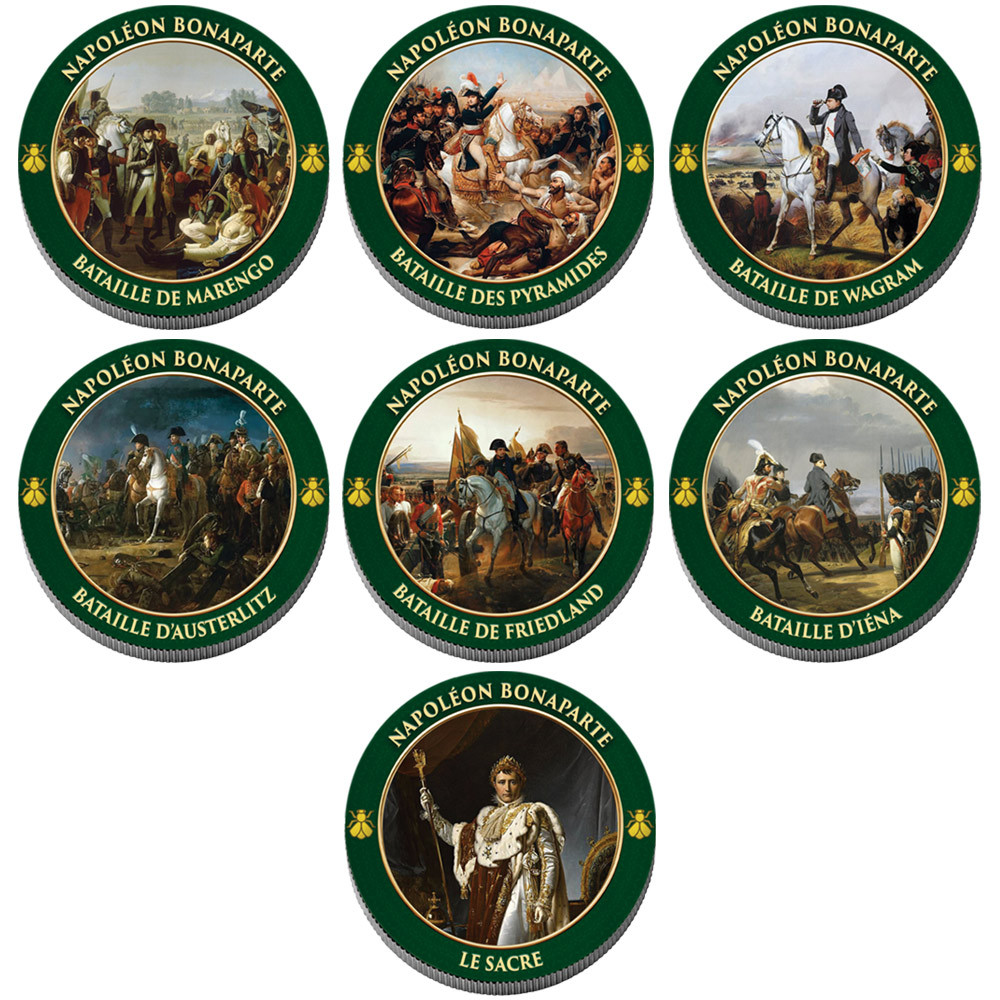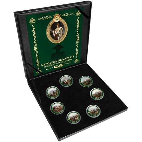7 x 1 Franc - Cupronickel. Ø 23 mm - 5 g. Millésimes variés. Éditions privées enduites et illustrées après émission. Dim. coffret : 155 x 160 mm.