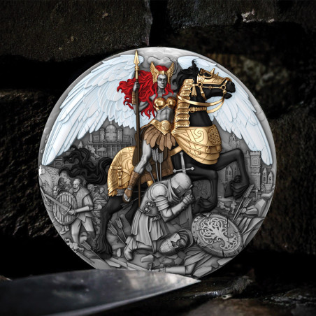Cette deux Onces d’Argent met à l’honneur la Valkyrie, guerrière mythique de la tradition nordique, guidant les héros vers leur destinée éternelle. Son Haut-relief et sa dorure sélective révèlent toute la force et la majesté de cette figure légendaire. Elle trouvera une place de choix dans votre collection